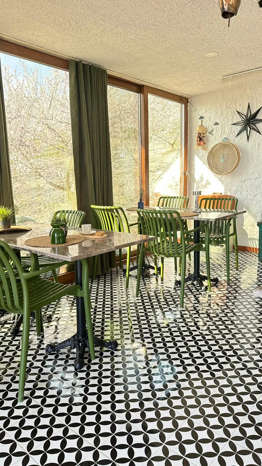 Projede tercih edilen Paris Sandalye modelleri, yeşil ve kiremit tonlarıyla mekâna sıcak ve davetkâr bir atmosfer kazandırdı.